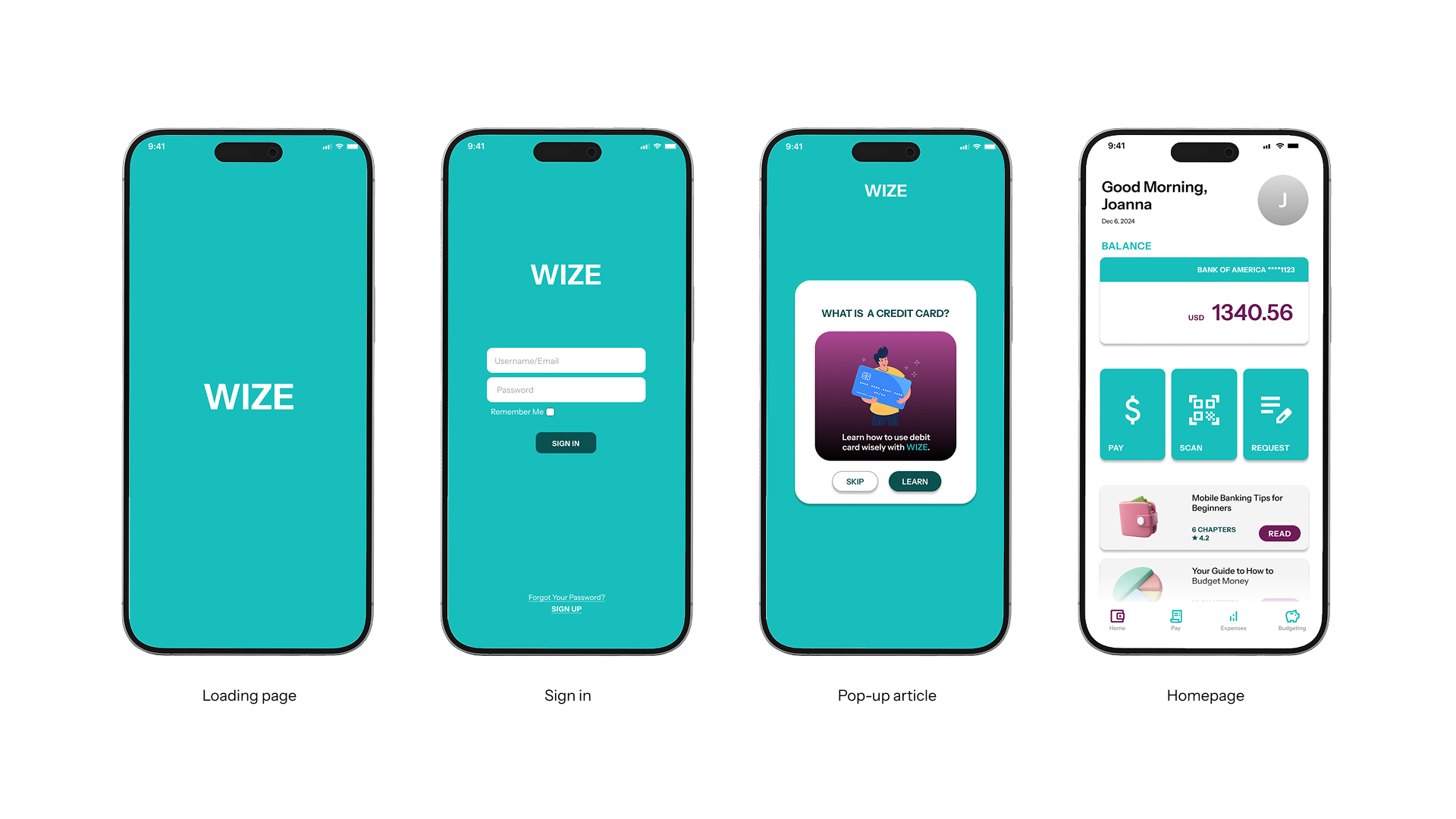 WIZE is a mobile banking app interface designed for beginners, specifically high school